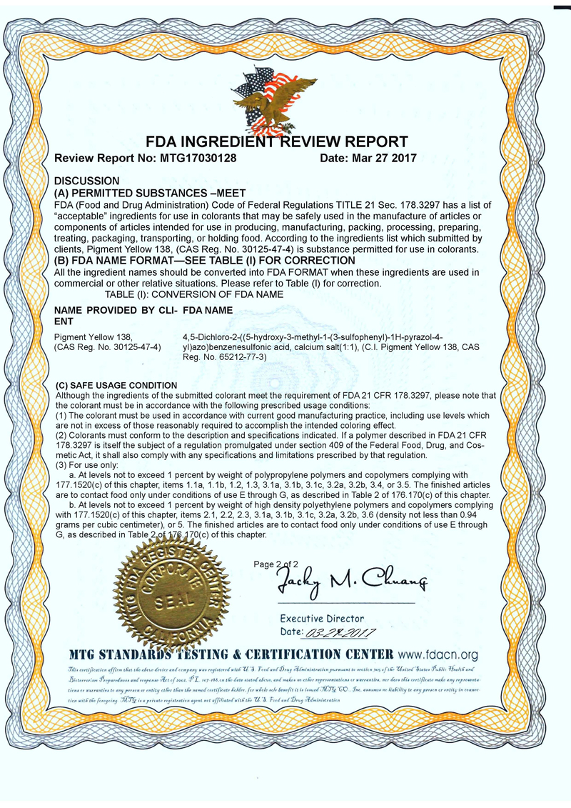 顏料黃138 (Pigment Yellow 138) 已通過FDA認證
